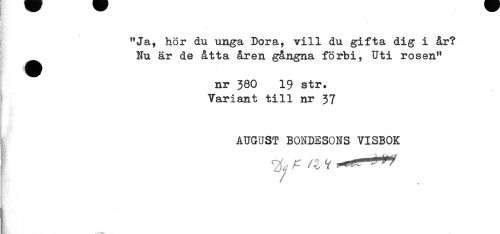 //// "Ja, hor du unga Dora, vill du gifta dig i år? //// Nu är de åtta åren gångna förbi, Uti rosen" //// nr 380 19 str. //// i Variant till nr 37 //// AUGUST BONDESONS VISBOK ////