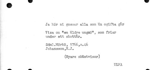 //// Ja hör ni gossar alla som än ogifta går //// Visa om *!.en äldre ungmö", som friar //// under ett skottår. //// Sdml.Mörkö, 5766,3.46 //// Johansson,N.J. //// (Nyare skämtvisor) //// ULMA //// ! ////