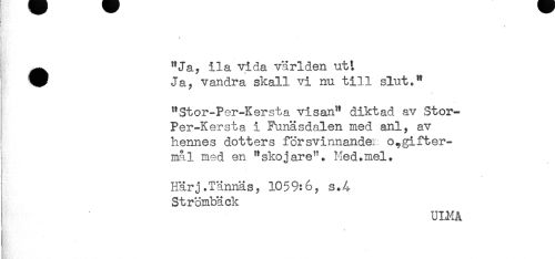 //// ^ "Ja, ila vida världen uti //// * Ja, vandra skall vi nu till slut." //// "Stor-Per-Kersta visan" diktad av Stor- //// Per-Kersta i Funäsdalen med anl, av //// hennes dotters försvinnande! o^gifter- //// mål med en "skojare*^. Med.mel. //// I Härj.Tännäs, 1059:6, s.4 //// Strömbäck //// ULMA ////