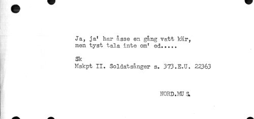 //// Ja, ja' har åsse en gång vatt kär, //// men tyst tala inte om' ed..... //// Sk //// Mskpt II. Soldatsånger s. 373.E.U. 22363 ////