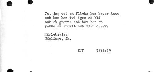 //// Ja? jag vet en flicka hon heter Anna //// och hon har två ögon så blå //// och så granna och hon har en //// panna så snövit och klar o.s.v. //// Kärleksvisa //// Häglinge, Sk. //// LUF 3512:39 //// t ////