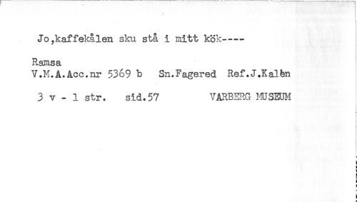 //// Joykaffekålen sku stå i mitt kok---- //// Ramsa //// V.M.A.Acc.nr 5369 b Sn.Fagered Ref.J.Kalbn //// f //// 3 v - 1 str. sid.57 VARBERG MUSEUM //// i //// i //// ) //// ! //// E //// i //// ! //// ! ////