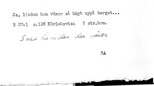 //// Ja, linden hon växer så högt uppå berget... //// B 27:1 s.128 Kärleksvisa 5 str.kom. //// j' , ^ //// RÅ ////