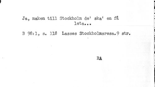 //// - //// ; //// Ja, maken till Stockholm de^ ska^ en få //// leta... //// B 98:1, s. 118 Lasses Stockholmsresa.9 str. [ //// # p //// L //// 1 //// RA ////
