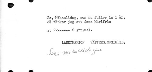 //// Ja, Mikaelidag, som nu faller in i år, //// då tänker jag att fara härifrån //// s. 22------6 str.nel. //// LANDTMANSON VÄSTERG.MUSIKBIL. ////