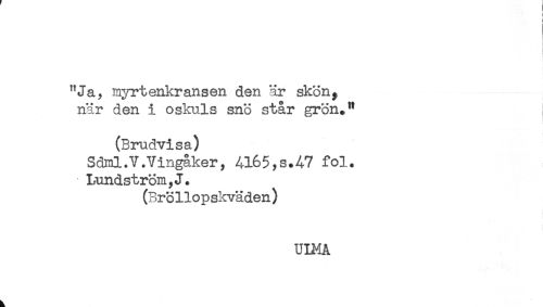 //// ! //// i //// "Ja, myrtenkransen den är skön^ //// när den i oskuls snö står grön." //// (Brudvisa) //// Sdml.V .Vingåker, 4165,s.A7 fol. //// Lundström,J. //// (Bröllopskväden) //// ULMA ////