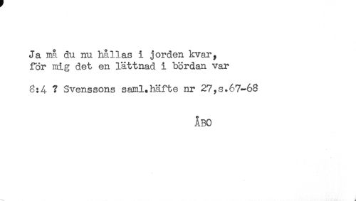 //// Ja nå du nu hållas i jorden kvar, //// för mig det en lättnad i bördan var //// 8:4 ? Svenssons saml.häfte nr 27,s.67-68 //// ÅBO ////