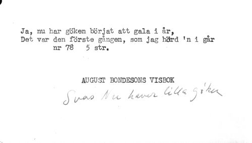 //// Ja, nu har göken börjat att gala i år, //// Det var den förste gången, som jag hord *n i går //// nr 78 5 str. //// AUGUST BONDESONS VISBOK //// * ////