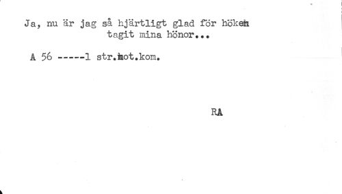 //// ! //// Ja, nu är jag så hjärtligt glad för höken //// tagit mina hönor... //// A 56 -----1 str.äot.kom. //// RA //// * ////