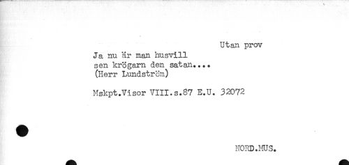 //// t //// Utan prov //// Ja nu är man husvill //// sen krögarn den satan.... //// (Herr Lundström) //// Mskpt.Visor VIII.s.87 E.U. 32072 //// NORD.MUS. ////
