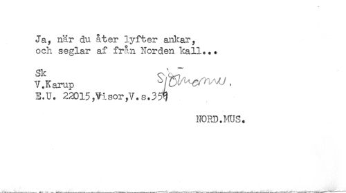 //// Ja, när du åter lyfter ankar, //// och seglar af från Norden kall... //// VJtarup Sjg^r,^ . //// E.U. 22015,Visor,V. s.35^} //// NORD. ms. ////