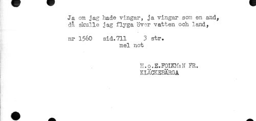//// * //// Ja om jag hade vingar, ja vingar som en and, //// da skulle jag flyga över vatten och land, //// * //// nr 1560 sid.711 3 str. //// mel not //// H.o.E.F0IKK:N FR. //// KLACKEBARGA //// R ^jjjjjjjj^^ ////