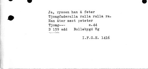 //// Ja, ryssen han ä feter //// ^^ Tjongfaderalla ralla ralla ra. //// ^^ Han äter mest peteter //// T j oag------s. 44 //// D 139 add Bollebygd Vg //// I.F.G.H. 1416 ////
