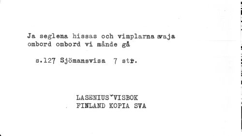 //// H //// t //// ) //// 5 //// Ja seglena hissas och vimplarna sraja //// ombord ombord vi månde gå i //// s.127 Sjömansvisa 7 sti?. //// E //// - //// H //// ! //// r //// j //// f //// LASENIUS"VISBOK //// FINLAND KOPIA SVA //// * //// k ////