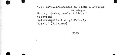 //// "Ja, skvallerkäringar dä finns i Lövsjön //// så många. //// Stora, tjocka, smala å långa.** //// (Nidvisa) //// Dal.Grangärde 11482,s.242-243 //// Blixt,O.(Nidvissyr) //// ULMA //// / ////