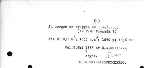 //// t': //// i //// (i) //// Ja sorgen är skuggan av livet..... //// (Av F.H. Franzén ?) //// Se: E 1831 k^; I833 1850 y; I856 rr, //// Enl.Ståkl 1865 av H,A,Kullberg //// ^ otydl. //// KB:S SKILLINGTRYCKSREG. ////