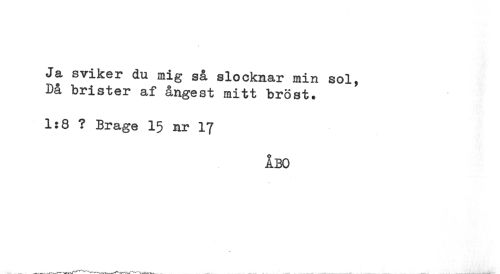 //// Ja sviker du mig så slocknar min sol, //// Då brister af ångest mitt bröst. //// 1:8 ? Brage 15 nr 17 //// ÅBO ////