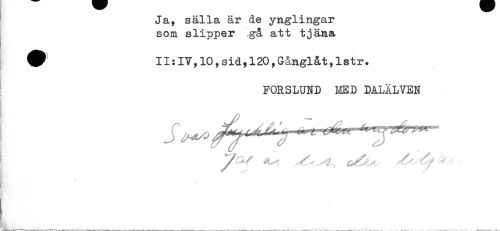 //// Ja, sälla är de ynglingar //// som slipper ,gå att tjäna //// ^ II: IV, 10, sid, 120, Gånglåt, Istr* //// FORSLUND RHED DALÄLVEN //// ? ////