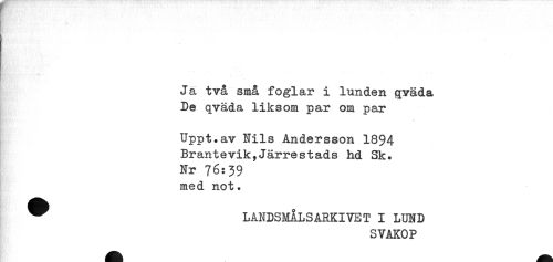 //// Ja två små foglar i lunden qväda //// De qväda liksom par om par //// Uppt.av Nils Andersson 1894 //// BrantevikyJärrestads hd Sk. //// Nr 76:39 //// med not. //// ^ LANDSMÅLSARKIVET I LUND //// SVAKOP ////