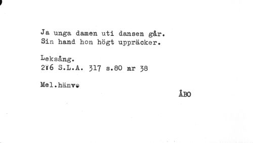 //// Ja unga damen uti dansen går. //// Sin hand hon högt uppräcker. //// Leksång. //// 2:6 S.L.A. 317 s.80 nr 38 //// Me1.hänve //// ÅBO ////