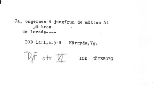 //// Ja, ongersen å jungfrun de möttes åt //// på bron //// de lovade---? //// IOD 14:1,s.5-8 Härryda,Vg. //// O^t IOD GÖTEBORG ////