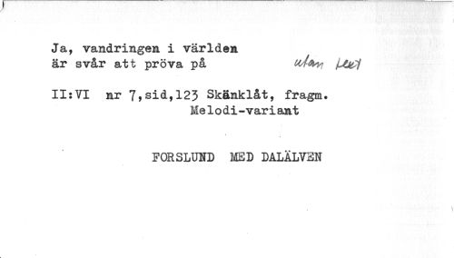 //// . //// Ja, vandringen i världen //// är svår att pröva på //// II:VI nr 7,sid,123 Skänklåt, fragm. //// Melodi-variant //// FORSLimD DALÄLVEN ////