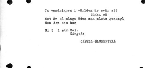 //// Ja vandringen i världen är svår att //// tänka på //// det är så många öden man måste genomgå //// Men den som har //// Nr 5 1 str.Mel. //// Gånglåt //// GAWELL-BLUMENTHAL //// i ////