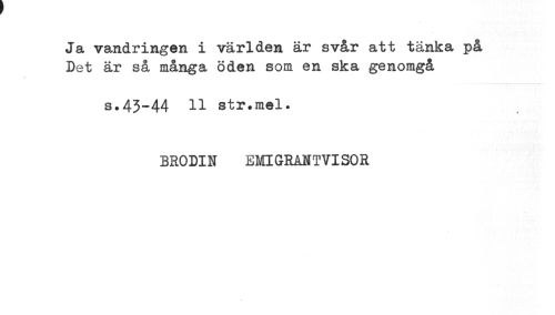 //// Ja vandringen i världen är svår att tänka på //// Det är så många öden som en ska genomgå //// s.43*44 11 str.mel. //// BRODIN EMIGRANTVISOR ////
