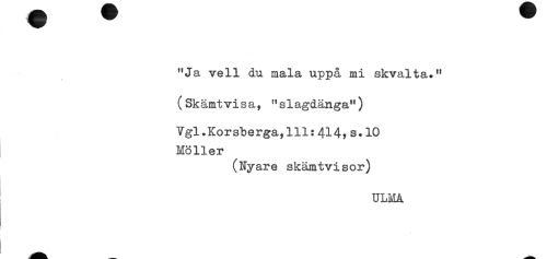 //// "Ja vell du mala uppå mi skvalta." //// (Skämt visa, "siagdänga") //// Vgl.Korsberga,lll:414,s.10 //// Möller //// (Nyare skämtvisor) //// ULMA //// ! ////