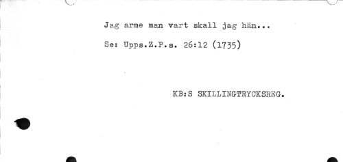 //// Jag arme man vart skall jag hän... //// Se: Upps.Z.P.s. 26:12 (1735) //// * //// i //// KB:S SKILLINGTRYCKSREG. //// i ////