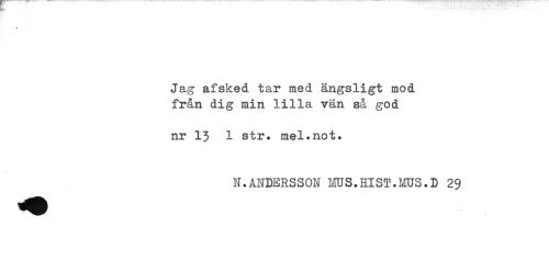 //// Jag afsked tar med ängsligt mod //// från dig min lilla vän s& god //// nr 13 1 str. mel.not. //// N.ANDERSSON MUS.HIST.mS.D 29 ////