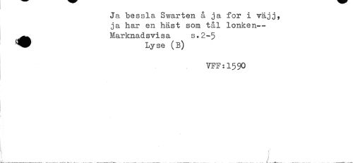 //// Ja. bessla Swarten å ja for i väjj, //// ja har en häst som tål lonken— //// ^^ Marknadsvisa s.2-5 //// V Lyse (B) //// VFF:1590 //// ! //// j ////