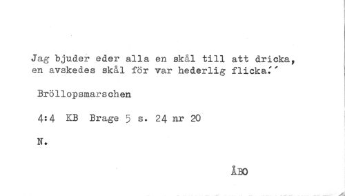 //// Jag bjuder eder alla en skål till att dricka, //// en avskedes skål för var hederlig flickad' //// Bröllopsmarschen //// 4:4 KB Brage 5 s. 24 nr 20 //// N. ////
