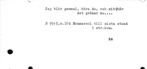 //// I //// I //// Jag blir gammal, kära du, och mit^hår //// det grånar nu.... //// B $5:3,s.l04 Sommarsol till sista stund //// 3 str.kom* //// 1 //// RA ////