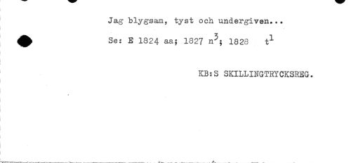 //// Jag blygsam, tyst och undergiven.*. //// ^ Se: E 1824 aa; 1827 n^; 1828 t^ //// I //// KB:S SKILLINGTRYCKSREG. //// ! //// t //// i //// ! ////