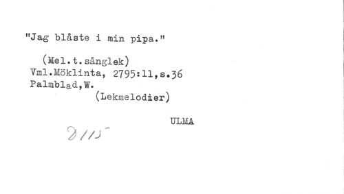 //// "Jag blåste i min pipa." //// (Mel.t.sånglek) //// Vml.Möklinta, 2795:11,8.36 //// Palmblad,W. //// (Lekmelodier) //// ULMA ////