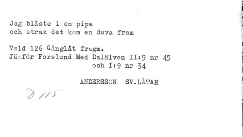 //// Jag blåste i en pipa //// och strax det kom en duva fram //// Vsld 126 Gånglåt fragm. //// Jäniför Forslund Med Dalälven 11:$ nr 45 ! //// och nr 34 [ //// ! //// ! //// AI^DERSSON SV. LÅTAR ' ////