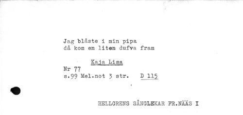 //// Jag blåste i min pipa //// då kom en liten dufva fram //// Kaja Lisa //// Nr 77 //// s*99 Mel.not 3 str. D 115 //// c //// HELLGRENS SÅNGLEKAR FR.NHS I ////