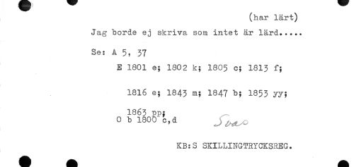 //// (har lärt) //// Jag borde ej skriva som intet är lärd..... //// Se: A 5, 37 //// E 1801 e; 1802 k; 1805 c; 1813 f; //// 1816 e; 1843 m; 1847 b; 1853 yy; //// 1863 pp; //// o b 180b cd ////