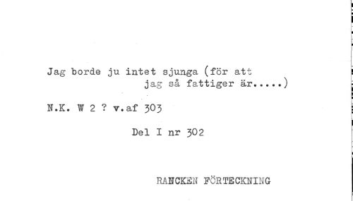 //// Jag borde ju. intet sjunga (för att ! //// jag så fattiger är.....) - //// ! //// N.K. W 2 ? v.af 3O3 //// 1 //// I //// Del I nr 302 //// RANCKEN FÖRTECKNING ////
