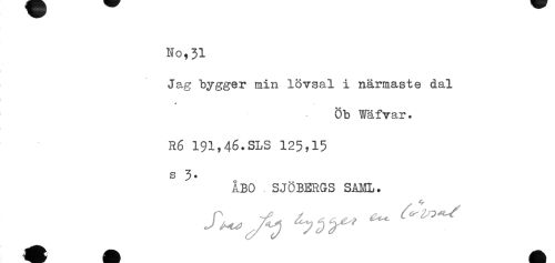 //// Jag bygger min lövsal i närmaste dal //// Öb Wäfvar. //// R6 191,46.SLS 125,15 //// s 3 * //// ÅBO SJÖBERGS SAML. //// ^ - ^ - ^ ^ ////