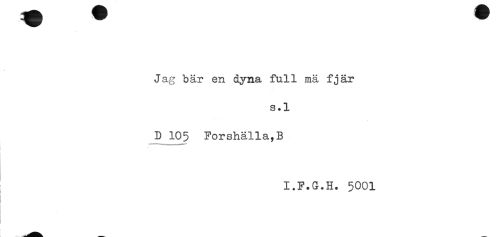 //// Jag bär en dyna full mä fjär //// s.l //// D 105 Forshälla,B //// I.F.G.H. 5001 ////