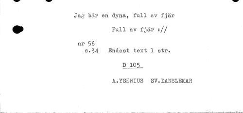 //// Jag bår en dyna, full av fjär //// ^ Full av fjär :// //// nr 56 //// s-34 Endast text 1 str. //// D 105,. //// A.YSENIUS SV.DANSLEKAR ////