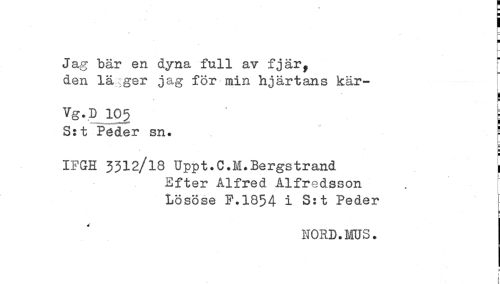 //// H //// Jag bår en dyna full av fjär, //// den lä :ger jag för min hjärtans kär- //// Vg.D 105 ' ; //// S:t Peder sn. ! //// 5 //// IFGH 3312/18 Uppt.C.M.Bergstrand j //// Efter Alfred Alfredsson //// Lösöse F.1854 i S:t Peder //// NORD.MUS. //// i //// i ////