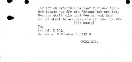 //// Jag bär en dyna full av fjär fjär ock fjär, //// den lägger jag för min järtans kär och kär. //// ^^ Hen vem. skall vila uppå den den ock den? //// I ^^ Jo det skall du ock jag, min vän vän ock vän. //// I (med musik) //// Vg. //// Åse hd. D 105 //// Ur Lampa: Folklekar No 349 B //// NORD.HUS. //// t ////