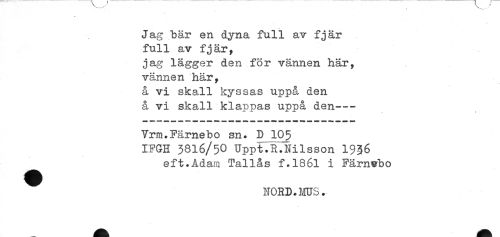 //// Jag "bär en dyna full av fjär //// full av fjär, //// jag lägger den för vännen här, //// vännen här, //// å vi skall kyssas uppå den //// å vi skall klappas uppå den--- //// Vrm.Färnebo sn. D 105 //// IFGH 3816/50 Uppt.R.Nilsson 1936 //// eft.Adam Tallås f.l86l i Färm&bo //// NORD.MUS. ////