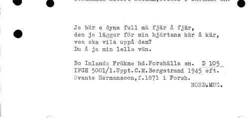 //// < //// Ja bår e dyna full må fjär å fjär, //// ^^ den ja lägger för min hjärtans kår å kär, //// vem ska vilå uppå den? //// Du å ja min lella vän. //// I //// Bo Inlands Fräkne hd.Forshålla sn. D 105 //// i IFGH 5001/1.Uppt.C.H.Bergstrand 1$45 eft. //// Svante Hermansson,f.1871 i Forsh. //// N03D<;MUS. ////