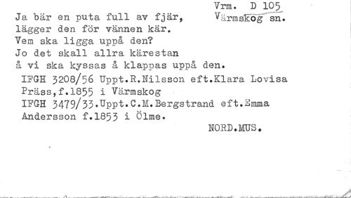 //// Ja bär en puta full av fjär, Varrag^og sn. //// lägger den för vännen kär. //// Vem ska ligga uppå den? //// Jo det skall allra kärestan //// å vi ska kyssas & klappas uppå den. //// IFGH 3208/56 Uppt.R.Nilsson eft.Klara Lovisa //// Prässyf.1855 i Värmskog //// IFGH 3479/33.Uppt.C.H.Bergstrand eft.Emma //// Andersson f.1853 i Clme. //// NORD.MUS* //// * ////