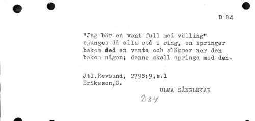 //// D 84 //// "Jag bär en vant full med välling" //// sjunges då alla stå i ring, en springer //// bakom ded en vante och släpper ner den //// bakom någon; denne skall springa med den. //// ! . -. ^ //// Jtl.Revsund, 2798:9,s.l //// i Eriksson,G. //// ULMA SÅNGLEKAR ////