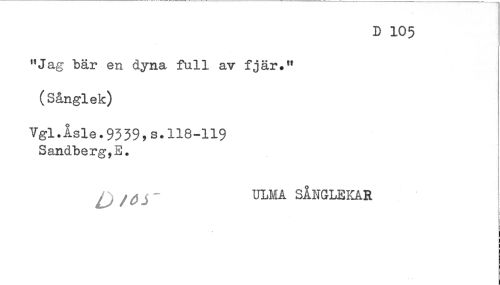 //// D 105 //// "Jag bär en dyna full av fjär." //// (Sånglek) //// Vgl.Åsle.9339,s.ll8-119 //// Sandberg, E. //// ULMA SÅNGLEKAR ////